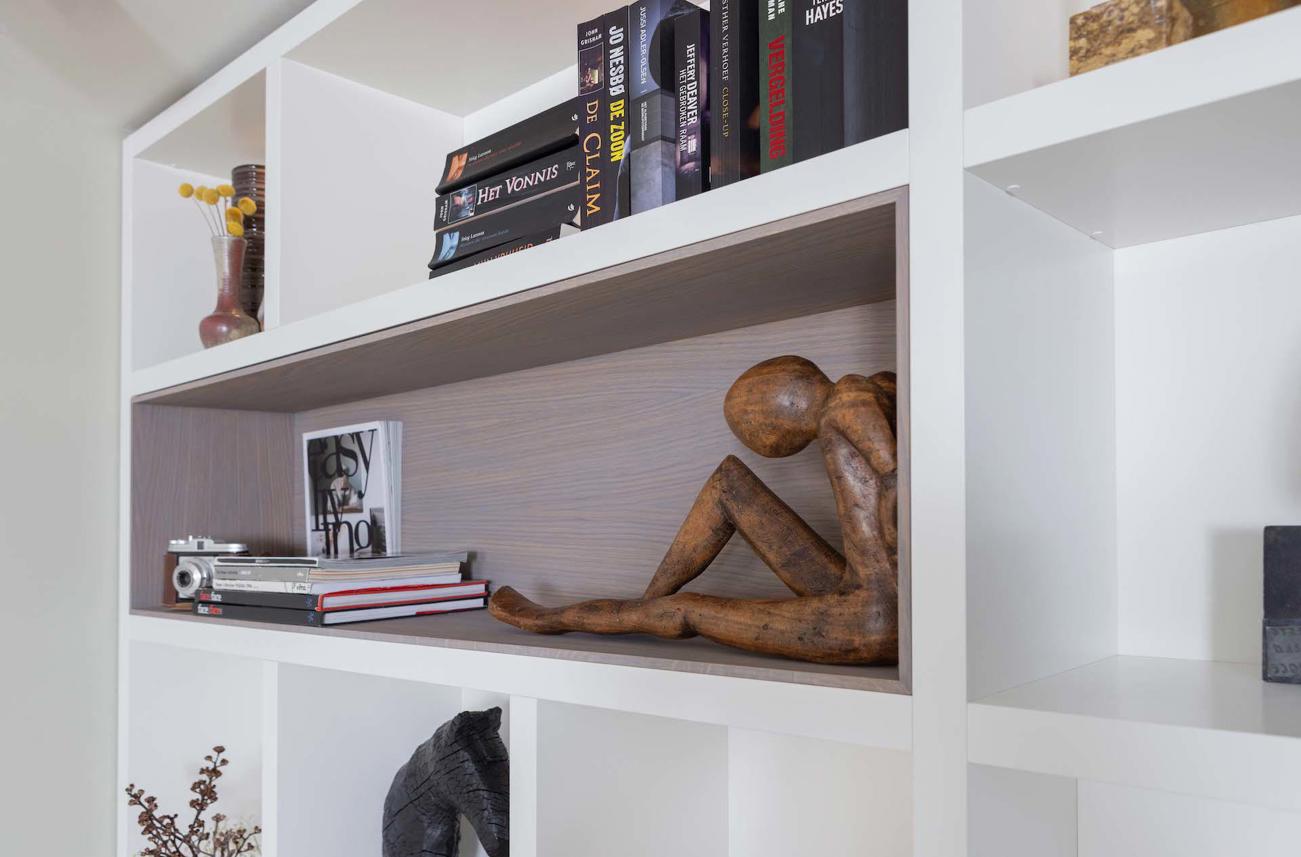 Voor een modern en licht penthouse ontwierp Ronald Schouwink een wandbrede boekenkast op maat. Het meubel combineert praktische opbergruimte met luxe details, zoals een geïntegreerde haard, push-to-openlades, subtiele ledverlichting en vier inzetkasten van gefineerd hout. De haard en verlichting zijn eenvoudig op afstand te bedienen, wat zorgt voor extra comfort en sfeer.