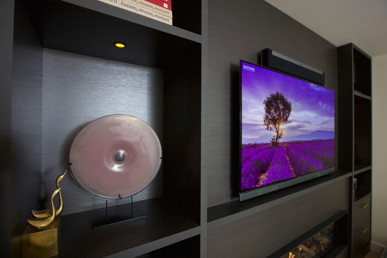 Voor deze gezellige tv-kamer ontwierp Ronald Schouwink een exclusieve designkast op maat met een geïntegreerde haard en subtiele ledverlichting. De kast combineert functionaliteit en sfeer en vormt het stijlvolle middelpunt van de ruimte.