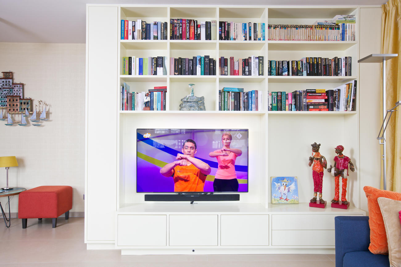 In dit appartement wilde de klant een thuiskantoor creëren zonder ruimte in te leveren op de woonfunctie. Onze oplossing: een kamerhoge tv-kast op maat die niet alleen de televisie huisvest, maar ook dienstdoet als afscheiding voor een compacte werkplek. Achter de kast ontstond zo een rustige kantoorruimte, slim geïntegreerd in de woonkamer.