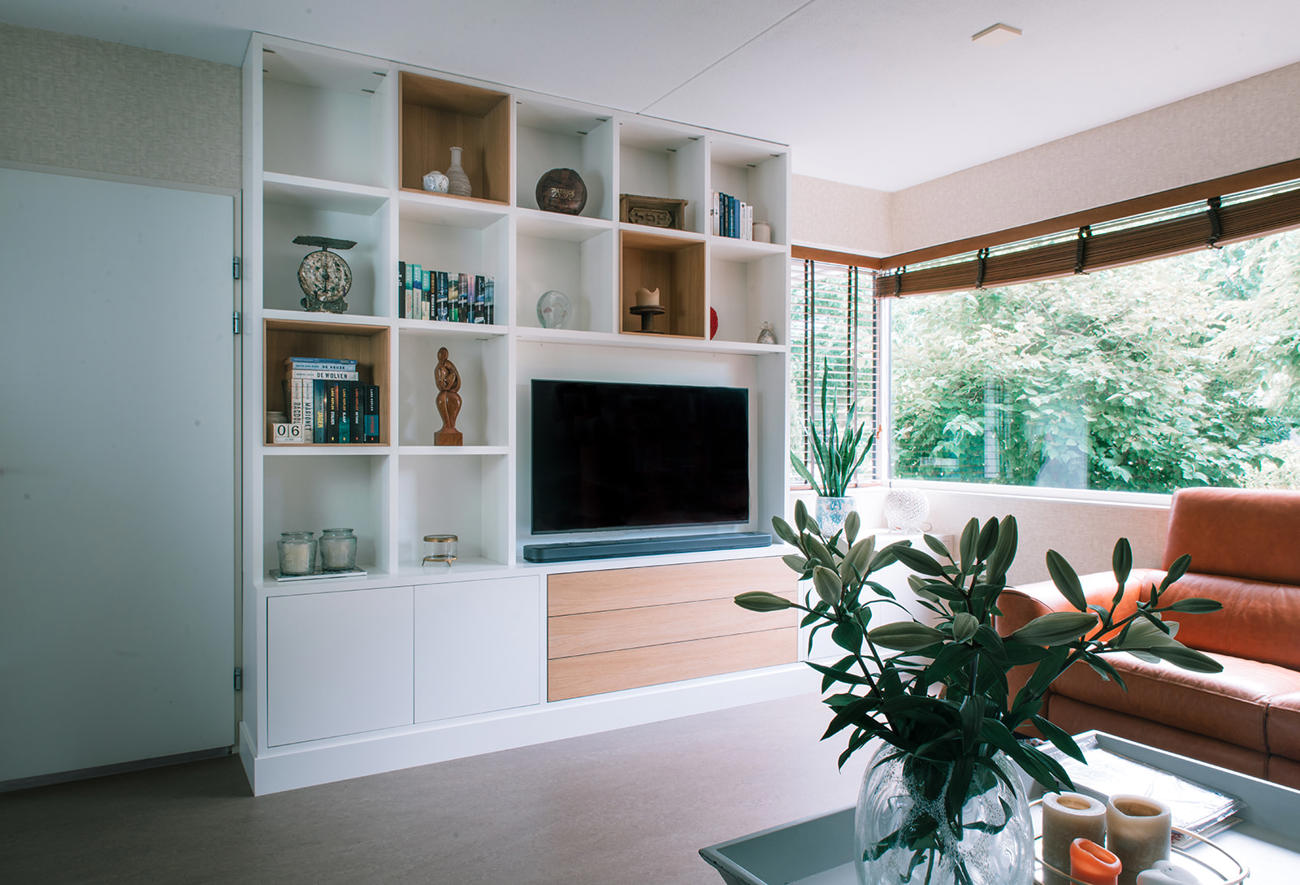 Voor een zitkamer in de regio Hoorn ontwierp Ronald Schouwink een vakkenkast op maat die ruimte biedt aan televisie, boeken én kunstobjecten. Het resultaat is een stijlvolle wandkast met een speels lijnenspel en warme houtaccenten.