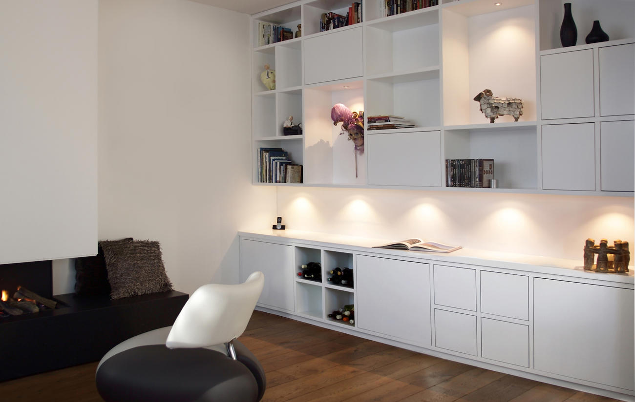 Voor deze ruimte ontwierp Ronald Schouwink een kamerhoge wandkast op maat, opgebouwd uit twee delen. Dankzij het open middenstuk lijkt het bovenste kastdeel te zweven, een speels en ruimtelijk effect dat perfect past in een modern interieur.